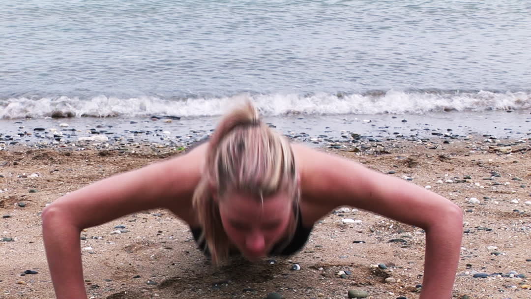 - Woman Exercising with Push-Ups on Beach Near Ocean
