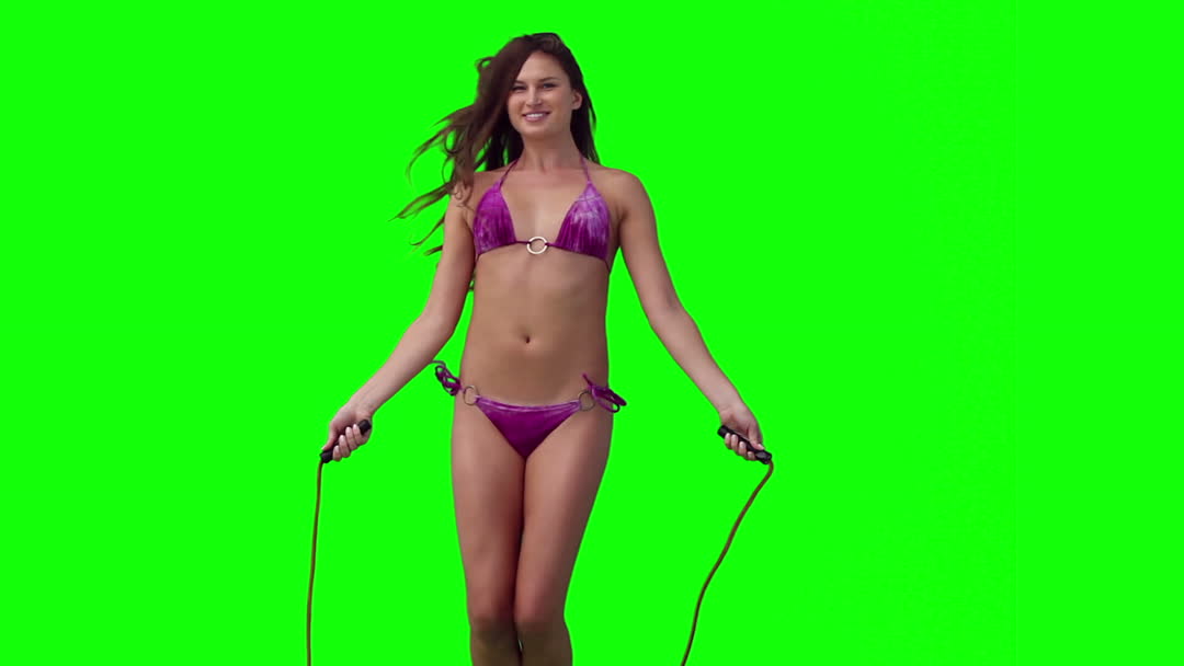 Woman doing a workout with a skipping rope while wearing a bikini. The green background offers versatile use in creative or digital projects, allowing for easy editing and integration. Suitable for fitness or exercise-related content and promotional materials.