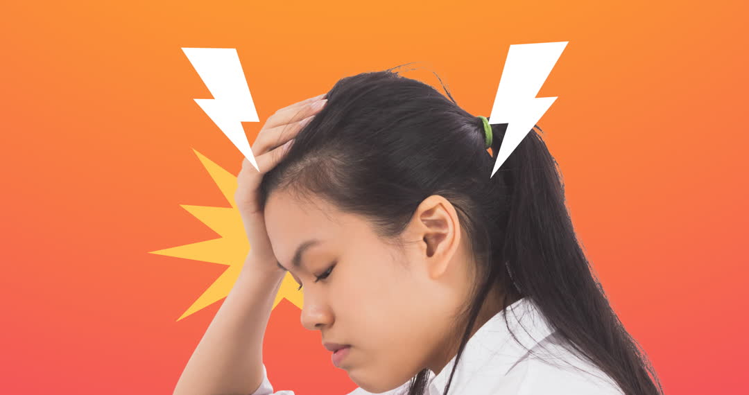 - Woman Experiencing Headache with Lightning Symbol on Gradient Background