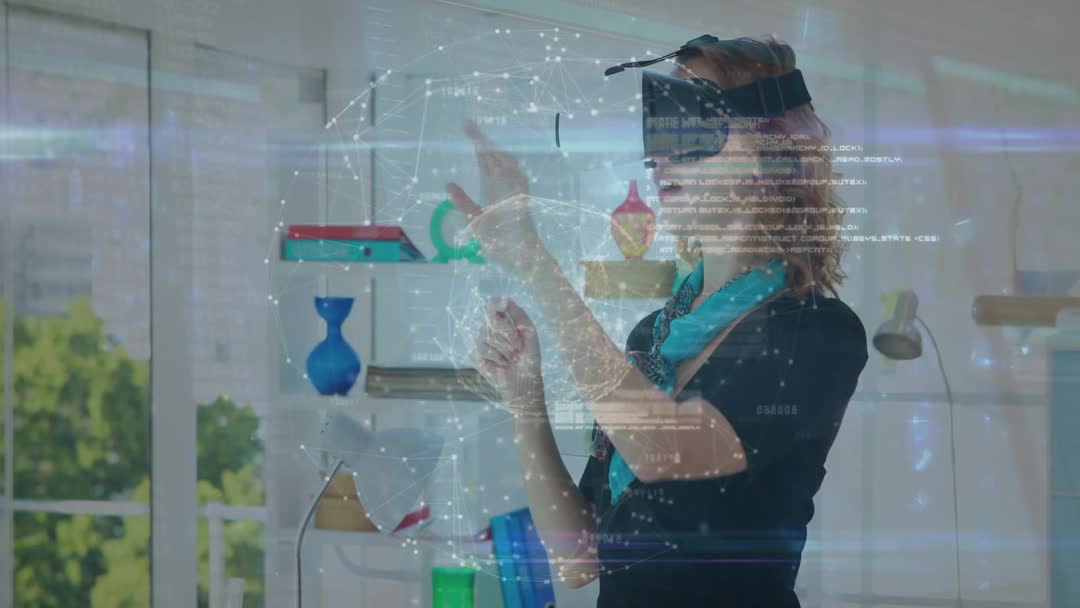 The video captures a woman engaging with virtual reality wearing a VR headset. A holographic digital globe appears around her hands, symbolizing futuristic technology and innovation. This visual perfectly encapsulates themes of immersion in tech, cutting-edge interfaces, and digital connectivity. It could be used for exploring applications in technology marketing, education on virtual interactions, or articles about evolving digital platforms and VR experiences.