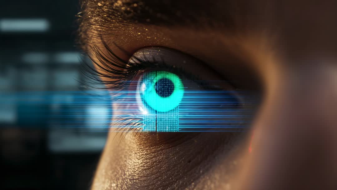 AI Generated Image. Showing cinematic close-up of woman eye with glowing cyan HUD ring locking onto iris while horizontal data band scanning across lashes and eyelid. Background keeping blurred laboratory interior and shallow depth of field enhancing focus on eye interface and digital grid reflections. Capturing moment of biometric authentication and augmented reality display for technology, security, medical, and cinematic narratives. Suiting cybersecurity campaigns, identity verification demos, fintech and access control presentations, corporate video openers, sci-fi sequences, UX motion design, and medical research features. Suggesting edit techniques such as extending to seamless loop, adding electronic sweep sound design, applying teal-and-gold color grading, overlaying animated text or data tags, and slowing frame for dramatic hold. Captured as high-resolution video frame suitable for 4K projects and close-up cropping for social media and website hero use.
