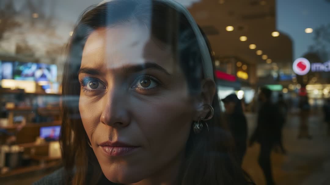 AI Generated Video. Video clip showing close-up portrait of woman behind reflective storefront glass while mall shoppers move and lights blur in background. Face and eyes drawing attention through layered reflections and subtle motion, conveying introspection and alertness. Composition working well for retail advertising, urban lifestyle storytelling, editorial coverage about consumer behavior, mental health and solitude in crowds, and brand commercials. Use as hero banner for website, opener for commercial, background for article about city life, or vertical cut for social media stories. Post-production tips: enhance warm interior highlights, preserve cool window reflections, apply gentle vignette to emphasize eyes, add soft grain for cinematic mood. Licensing suggestions: suitable for marketing campaigns, editorial publications, stock footage libraries, storefront design presentations.