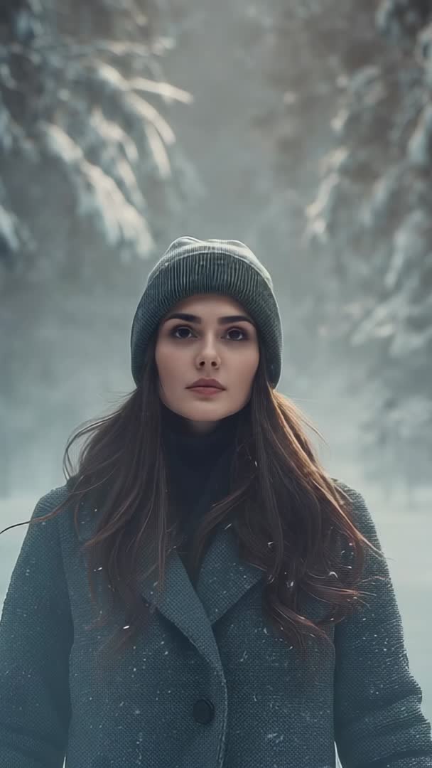 AI Generated Video. Vertical footage showing woman gazing upward while light snowfall drifting through pine-lined path. Close-up portrait framing capturing contemplative expression, beanie and wool coat textures, soft backlighting creating cinematic depth and gentle bokeh. Ideal for winter fashion promos, travel or outdoors campaigns, mindfulness or solitude themed videos, social media stories, and mobile-first hero reels. Post-production tips: color grading toward cool desaturation or teal tones, adding slow zoom or gentle pan, layering soft wind and distant forest ambience, placing text overlays or product callouts in upper frame. Licensing suited for commercial ads, brand content, editorial features, and seasonal marketing.