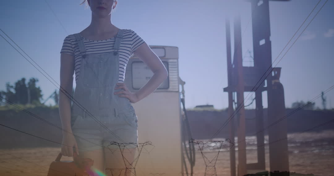 A conceptual blend of a woman holding a canister at a deserted gas station under overalls uniform and intersected with electricity poles, suggesting themes of fuel consumption and renewable energy possibilities. Ideal for topics of energy resources, transportation evolution, and abstract lifestyle presentations.