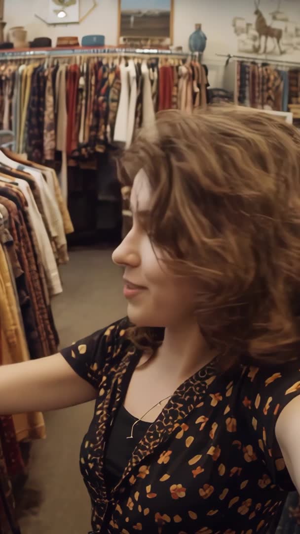 AI Generated Video. Showing vertical clip of young woman holding smartphone while browsing thrift shop clothing racks and inspecting fabrics. Shot from selfie-arm perspective, capturing colorful vintage garments, textured fabrics, cozy retail interior. Serving social media vlogs, shopping haul videos, sustainable fashion campaigns, thrift store promotions, styling tutorials, ecommerce banners, B-roll for documentaries about slow fashion. Emphasizing candid, relatable mood, highlighting casual outfit details, showcasing hands-on fabric inspection. Optimizing vertical format for Instagram Reels, TikTok, YouTube Shorts, mobile ads. Working well for lifestyle blogs, retail marketing, influencer content, creative editing sequences. Recommending close-up cuts, using natural audio, adding on-screen captions for step-by-step thrift haul storytelling.