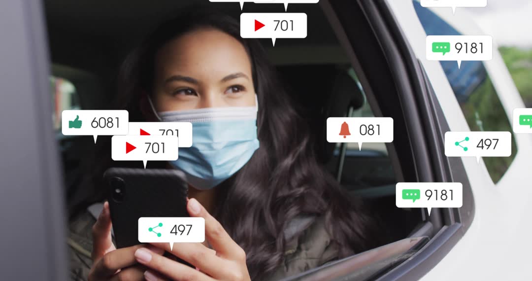 Woman sitting in back seat of car browsing social media, displaying various notification icons. Useful for themes involving connectivity, digital communication, technology impact on daily life, and social media usage.