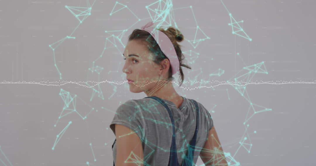 A young woman wearing a headband in a t-shirt stands with her back partially towards the viewer, against a digital background showcasing interconnected graphical representations. Light neon lines and nodes create a network overlay, suggesting concepts of data connectivity and futuristic technology. Perfect for illustrating technology transformation, internet networks, or digital communication themes in modern advertising or educational materials.