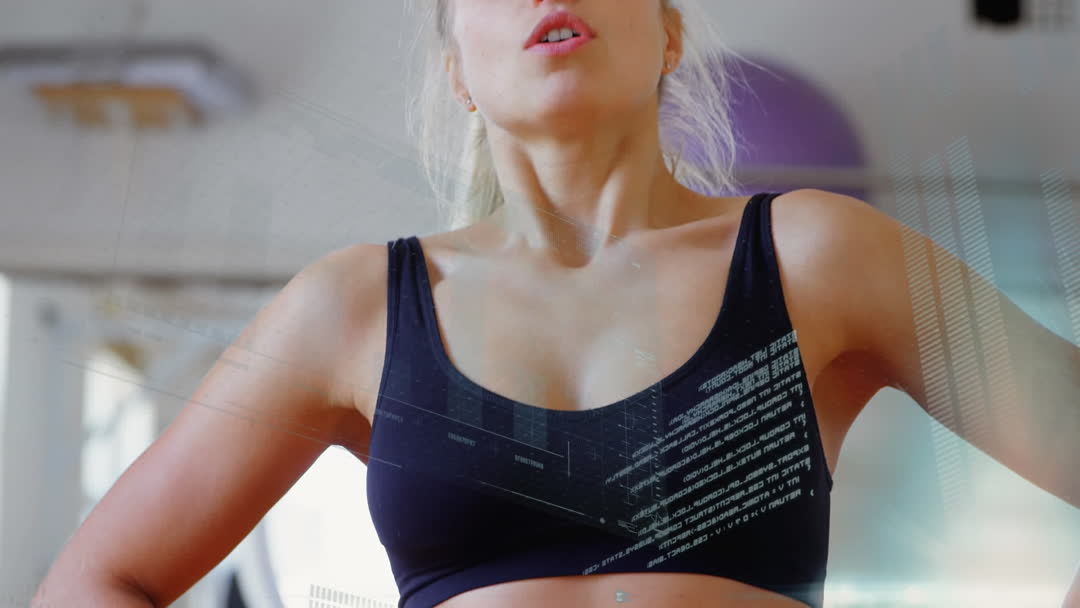 - Woman in Gym Doing Workout with Abstract Digital Graphics Overlay