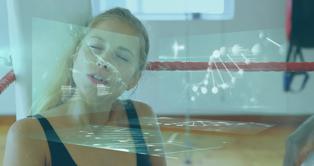 A woman in a gym setting engages with a futuristic holographic display showing scientific data and a DNA strand. This scene underscores themes of cutting-edge technology, human interaction with digital interfaces, and sports science. It can be used for articles or presentations related to innovation in fitness technology, biotechnology advancements, or immersive learning environments.