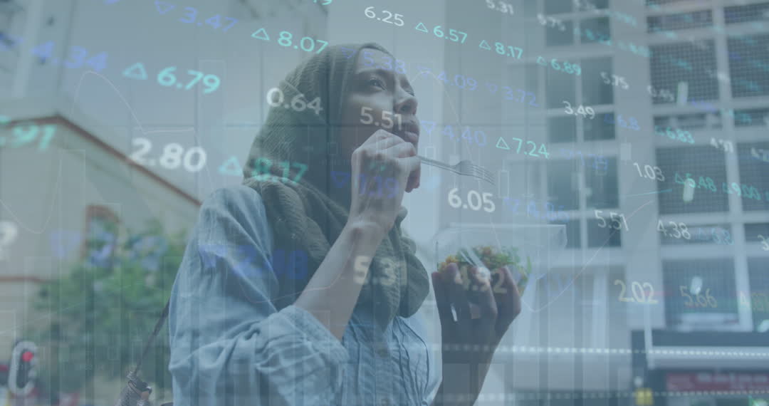 Young woman in hijab enjoying a snack on a bustling city street while stock market graphics overlay the scene. This contrasts daily life with global financial trends. Use this for illustrating intersections of everyday life with financial markets, diversity in business, or global economy topics.