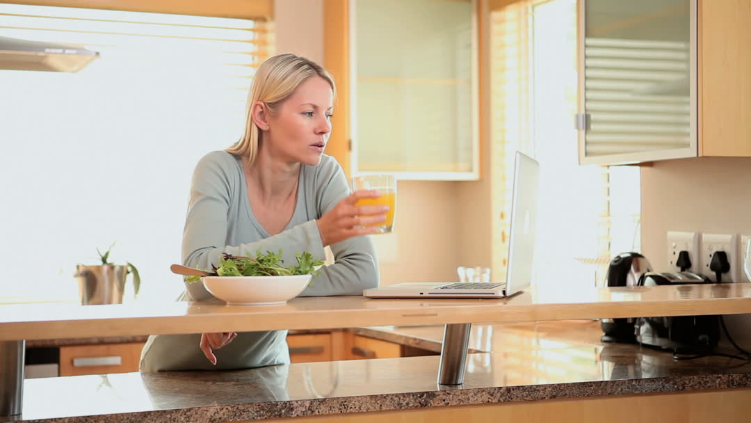 Woman in Kitchen Working on Laptop with Refreshment Video