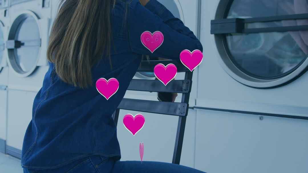Woman in Laundromat with Digital Heart Motifs Overlay Video