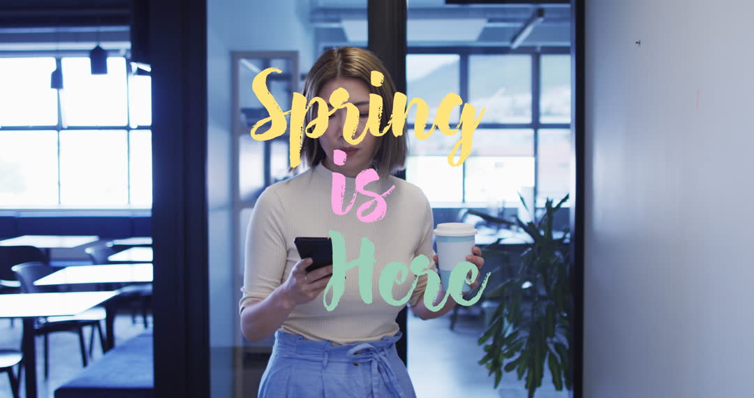 Scene features woman casually dressed, standing indoors, holding coffee cup and smartphone, with colorful text 'Spring is Here' overlay. Useful for seasonal office promotions, spring-themed announcements, or social media campaigns. Conveys energy and fresh beginnings in a business environment.
