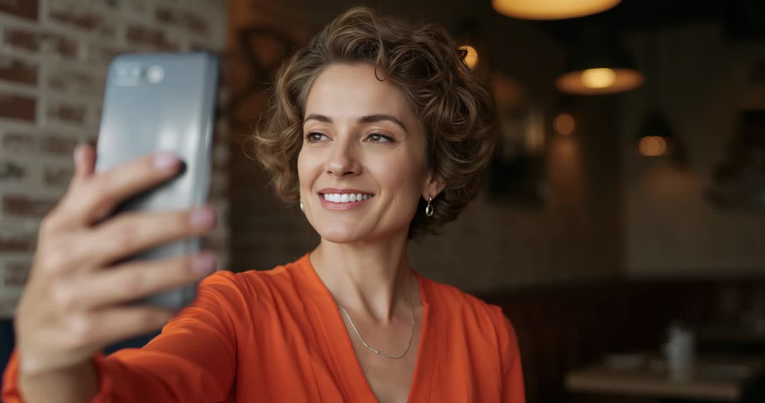 - Woman in Orange Blouse Taking Selfie at Cozy Cafe