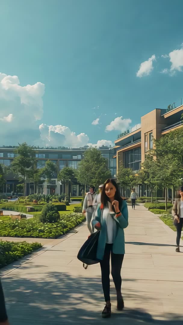 AI Generated Video. Foreground woman walking toward camera, adjusting tote strap while carrying large black handbag. Midground pedestrians walking along paved campus walkway, modern university buildings lining sides of frame, manicured lawns and trees adding lush greenery contrast. Sky occupying upper third with bright blue tone and scattered clouds, creating airy open feel. Vertical video composition emphasizing subject motion and headroom, natural daylight producing soft shadows and warm highlights. Ideal for social media vertical ads, campus tour reels, university recruitment content, back-to-school campaigns, lifestyle and fashion features, commuter or urban living stories, mobile app background loops. Editing suggestions: cropping for 9:16 platforms, adding gentle slow motion or loop for emphasis, applying color grade to boost teal coat and green foliage, overlaying lower-third text or logo, adding light acoustic or ambient soundtrack, including captions for silent autoplay. Composition readiness: clear sightlines, minimal branding, versatile for editorial and commercial use.