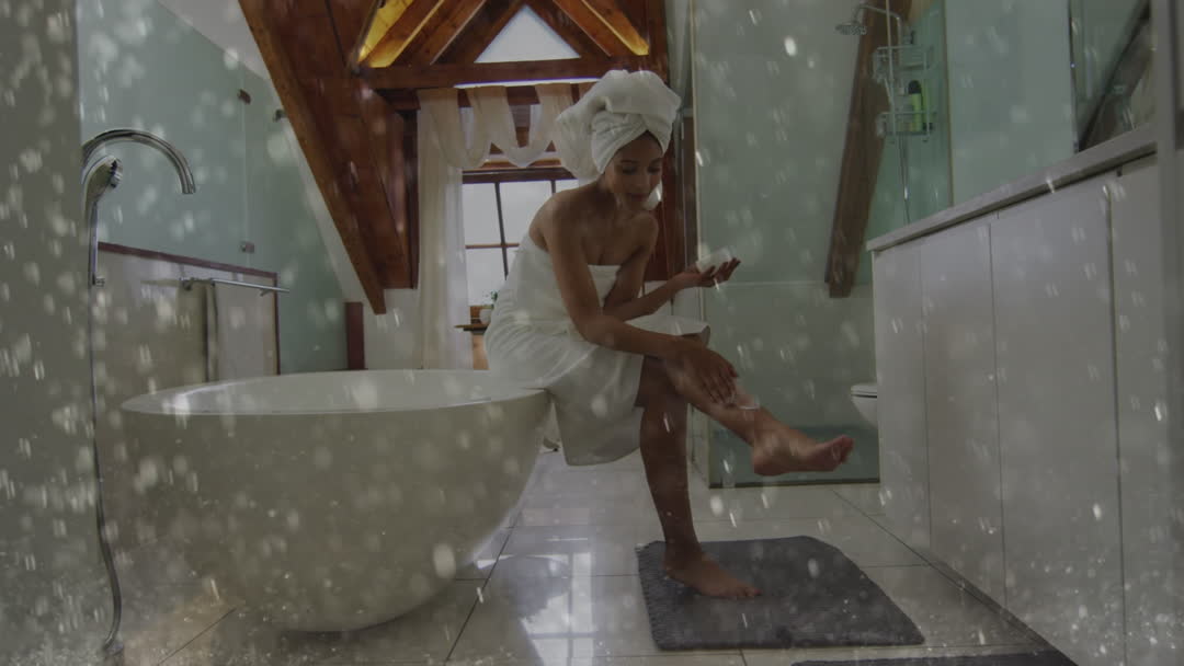 - Woman in Towel Moisturizing Legs in Stylish Bathroom with Falling Glitter