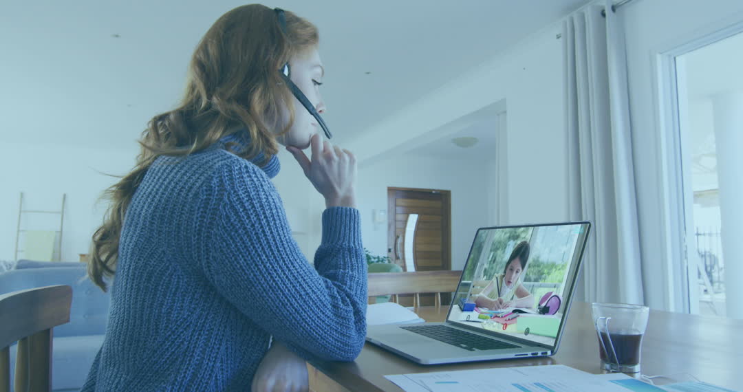 Woman wears headset and engages in virtual meeting on laptop at home. She appears focused as she analyzes documents, suggesting productivity and modern communication. Suitable for themes related to remote work, digital communication, and home-based business solutions.
