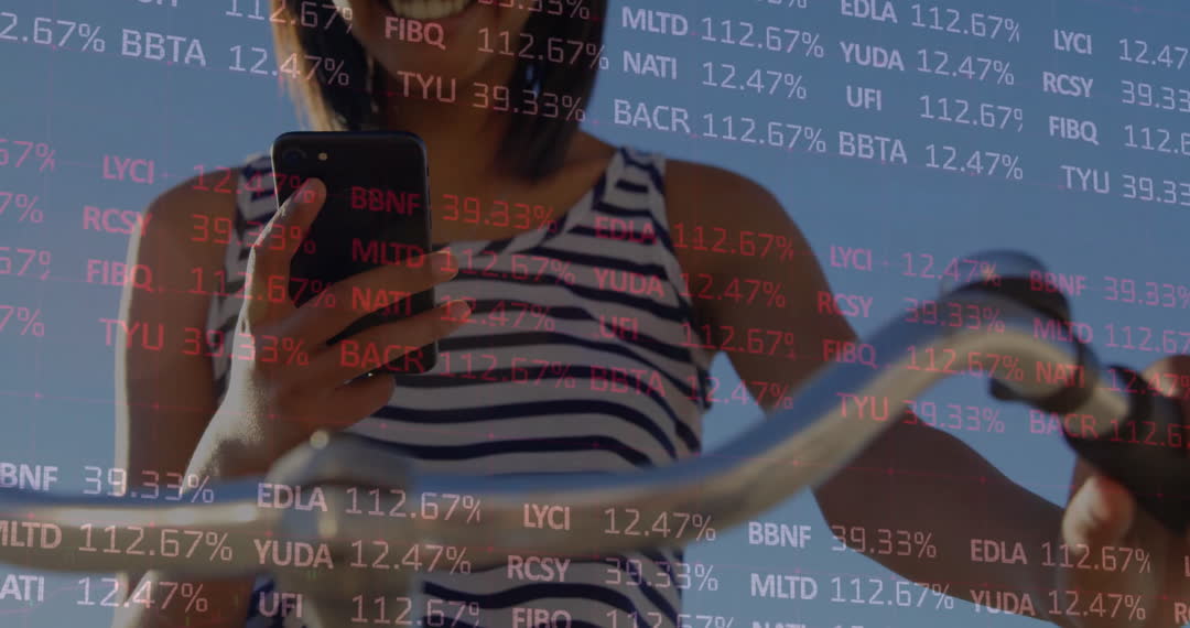 Depicts a woman using a smartphone with a digital overlay of stock market data. Suggests the integration of technology with financial activities such as trading and monitoring market trends. Useful for themes about mobile finance apps, stock investment tools, or personalized financial services.