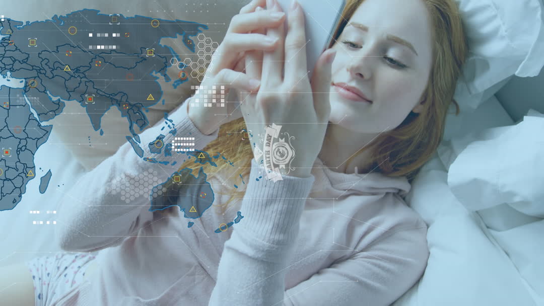 Woman laying in relaxed position using smartphone with digital infographic overlay. Perfect for illustrating global communication, modern technology influence, or innovative digital solutions in personal devices. Ideal for use in technology articles, digital ads, and global business contexts.