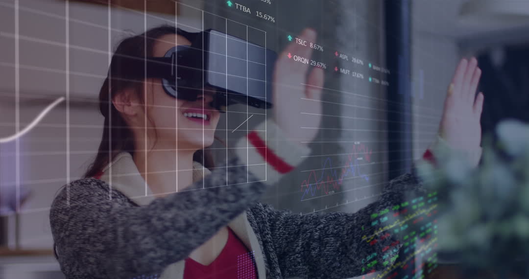 Caucasian woman wearing a virtual reality headset is surrounded by digital graphs and data interfaces, illustrating the integration of technology with hands-on virtual interaction. The video encapsulates innovation and a futuristic approach to data visualization, which is ideal for use in technology presentations, marketing campaigns, and educational materials focused on VR advancements.