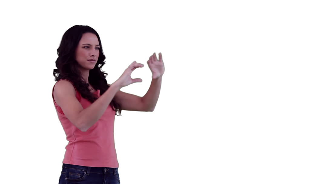 A woman stands engaging with an invisible surface, suggesting use of advanced technology or digital interaction. Ideal for illustrating concepts of future technology, interface design, and digital communication in presentations or online articles.