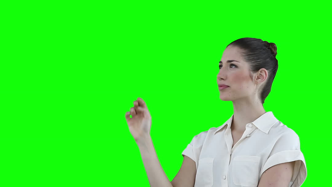 Woman Interacting with Virtual Touchscreen on Green Background Video