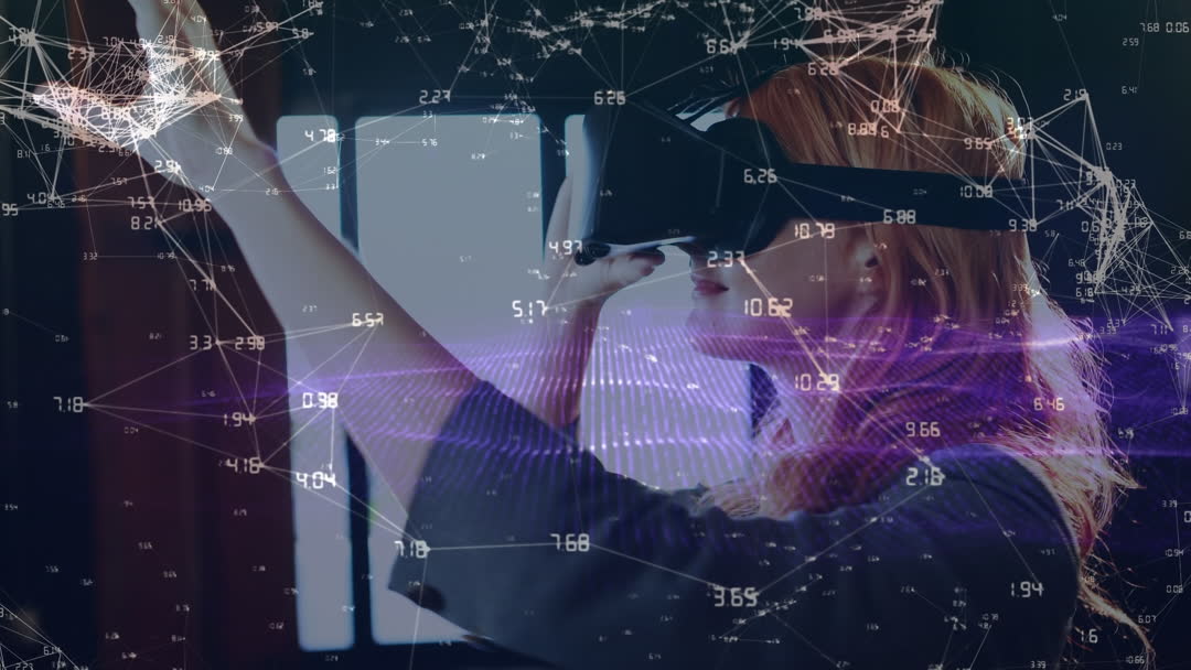 Woman engaging with virtual reality device, experiencing immersive digital environment, overlaid with a visual network of global data connections and numbers. Ideal for articles or presentations on technology innovation, immersive experiences, and digital transformation concepts.