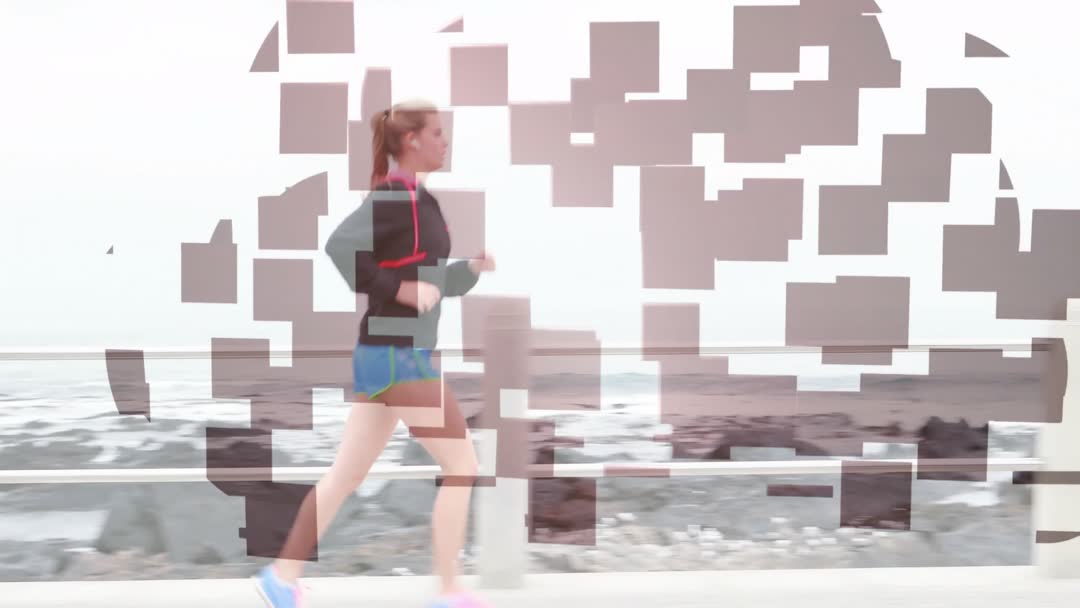 Woman Jogging by Sea with Digital Tech Overlay Video