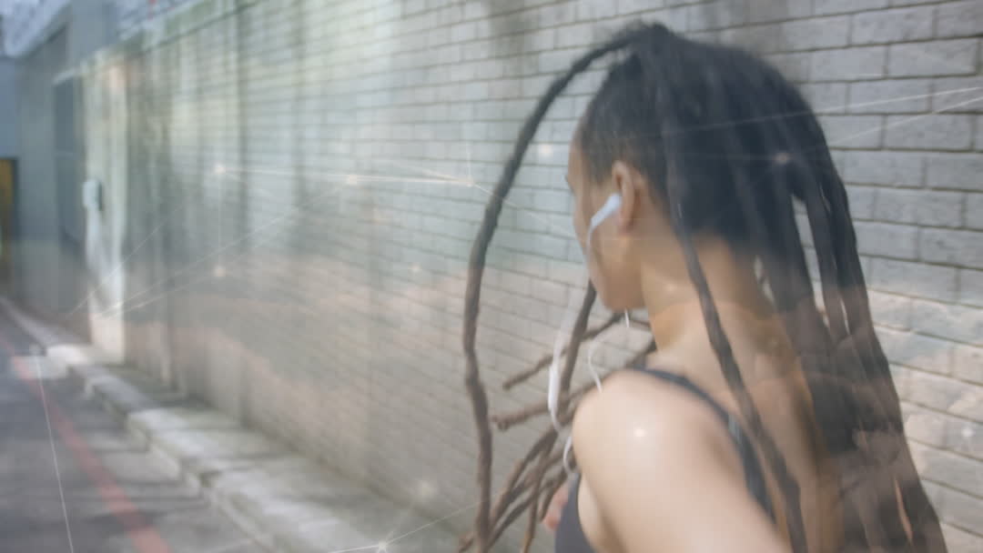 - Woman Jogging with Earbuds and Technological Network Overlay