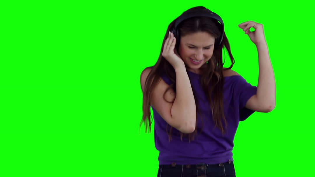 A cheerful woman engaged in dance and effortlessly exuding happiness while listening to music on her headphones stands against a vibrant green background. This bright and vivid scene can be used for music or lifestyle-related promotions, green screen editing, commercials depicting leisure, or advertisements for audio products.