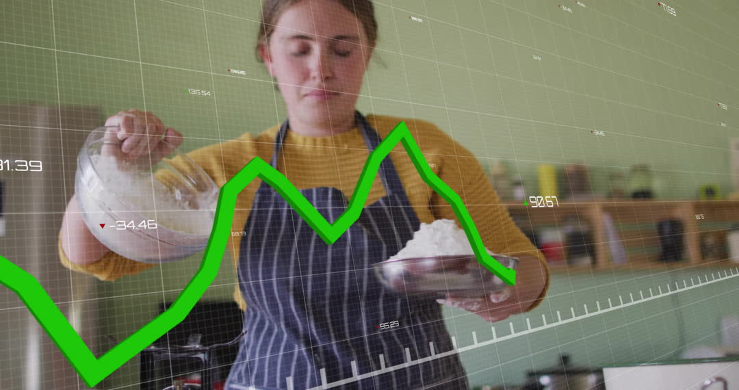 Woman Measuring Ingredients with Overlay of Green Data Trend Line Video
