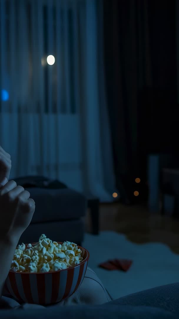 - Woman Munching Popcorn on Sofa at Night Vertical Video Cozy Home Leisure and Relaxation