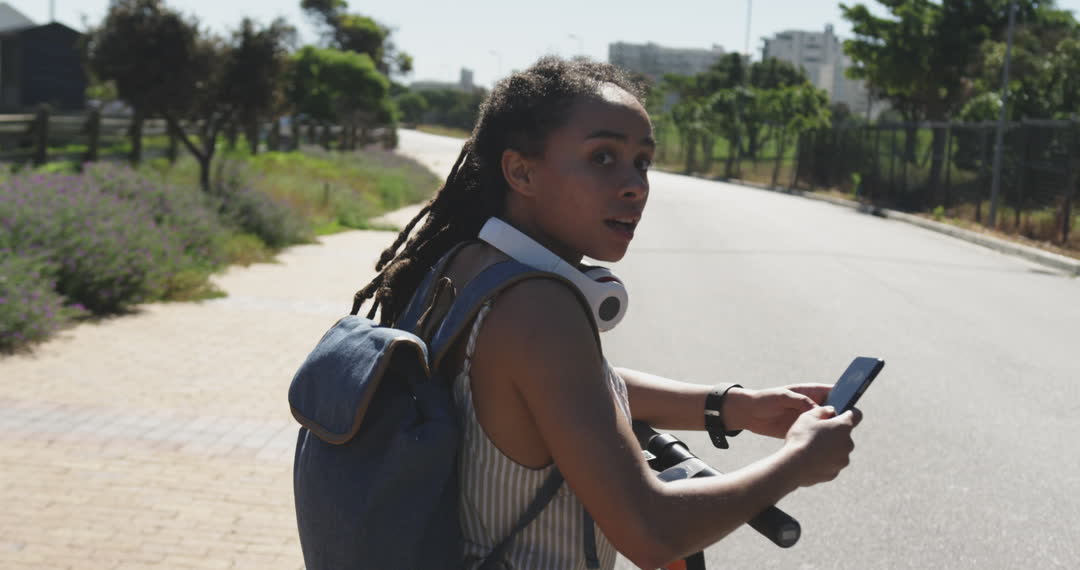 - Woman on Electric Scooter Using Smartphone in Urban Street