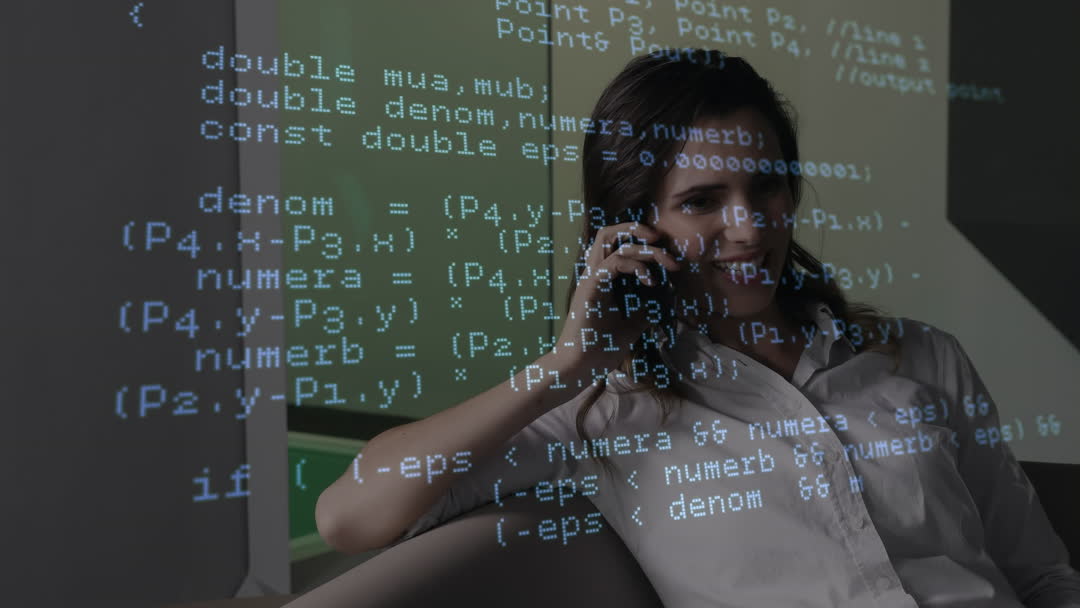 Image shows a woman talking on a smartphone while computer code appears overlayed, illustrating a blend of real-world conversation and digital technology. Ideal for use in tech and communication-themed projects, advertisements for software companies, or articles discussing work-life balance in modern tech careers.