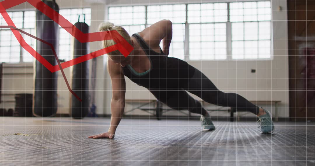 Clip showing woman performing side plank with deliberate weight shift while lowering torso, building core strength and improving balance. Low-angle perspective emphasizing muscle engagement and stability, studio daylight streaming through windows creating natural contrast. Red tracking line and grid overlay visualizing motion data and performance metrics, suggesting sports analytics and training feedback. Usage ideas include fitness app tutorial clips, online workout classes, gym marketing campaigns, personal training demos, strength and conditioning presentations, physiotherapy guides, wearable tech demos, sports science articles, and health and wellness blog content. Clip working well as hero background for landing pages, social media ads, instructional sequences, and corporate wellness materials; composition and lighting allowing easy text overlay and graphic integration.