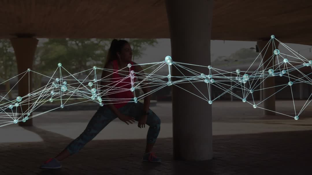 Featuring woman performing side lunge under urban canopy while glowing node network slides across midline, merging athletic movement with digital data overlay. Clip capturing dynamic motion, balance, and lower-body strength against modern architectural columns and open plaza. Working well for fitness app promos, wearable tech campaigns, gym branding, urban training tutorials, sports science editorials, and social media reels. Editors layering text overlays, color grading to cool teal tones, and adding upbeat soundtrack for high-energy delivery. Video framing allowing close-up crop for vertical reels and wide crop for full-width hero banners, providing versatile use for advertising, web hero visuals, and presentation backdrops.