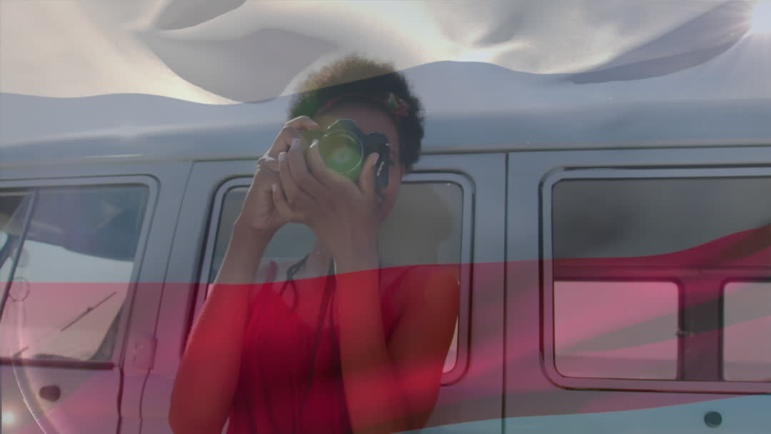 Creative depiction combining African American woman using camera and digital animation overlay of Russian flag. Useful for concepts of diversity in photography, global interconnectedness, or digital and cultural fusion.