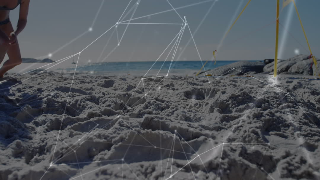 A dynamic scene of a woman playing volleyball on a sandy beach, enhanced with a network of digital connections overlaying the setting. The environment suggests a blend of traditional sports and modern technology. This can be used for content centered around lifestyle, technology's impact on sports, fitness pursuits, summer activities, or digital innovation.