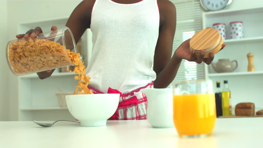 - Woman Pouring Cereal into Bowl at Breakfast Routine