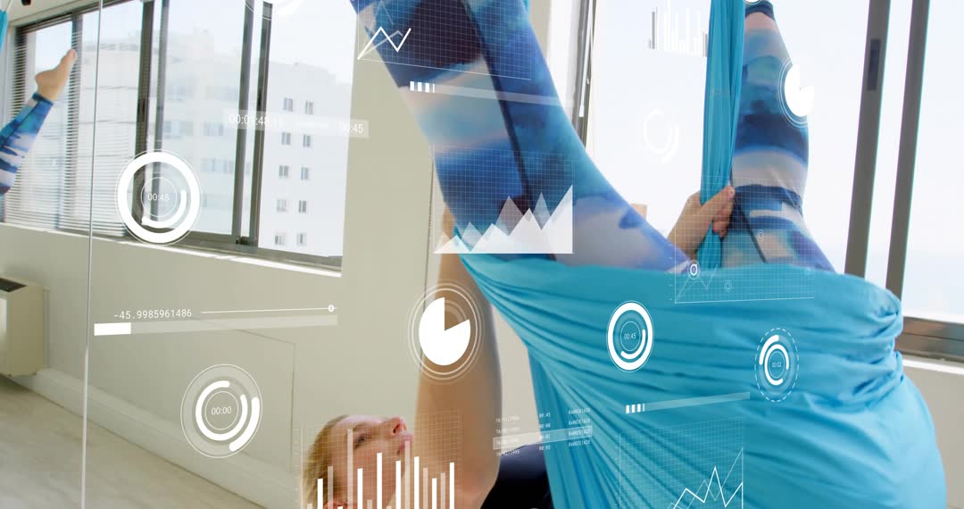 - Woman Practicing Aerial Yoga with Digital Data Overlay
