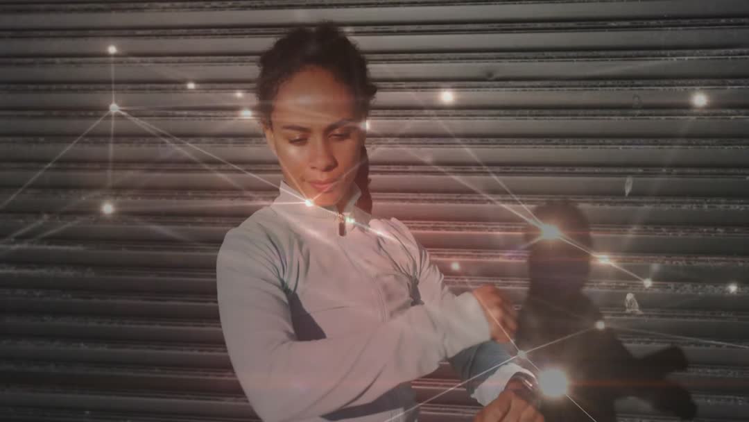A woman in a focused posture prepares to perform a martial arts technique outdoors. She is wearing fitness attire and surrounded by conceptual sparks and motion effects, adding intensity to her action. This scene depicts strength, grace, and discipline, making it suitable for content related to fitness training, martial arts promotion, or motivational lifestyle videory.