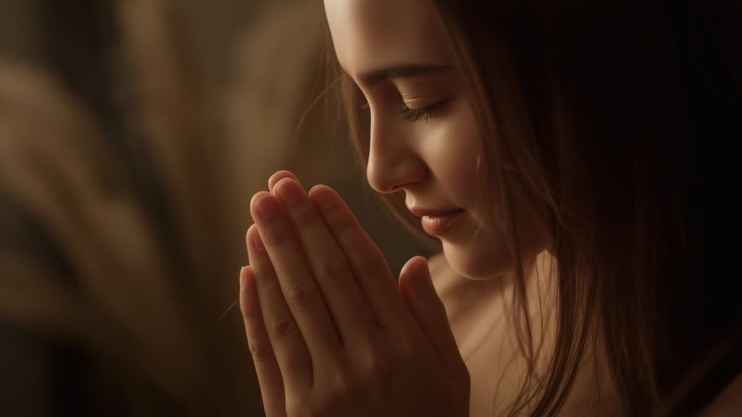 - Woman Praying with Clasped Hands in Warm Light — Close-Up Meditation Video