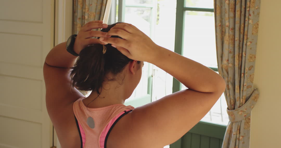 Female getting ready for a virtual workout at home, emphasizing home exercise and self-care. Suitable for use in articles or promotions highlighting home fitness routines, empowering women to stay physically active. Ideal for exercise programs, virtual training content, or fitness blogs