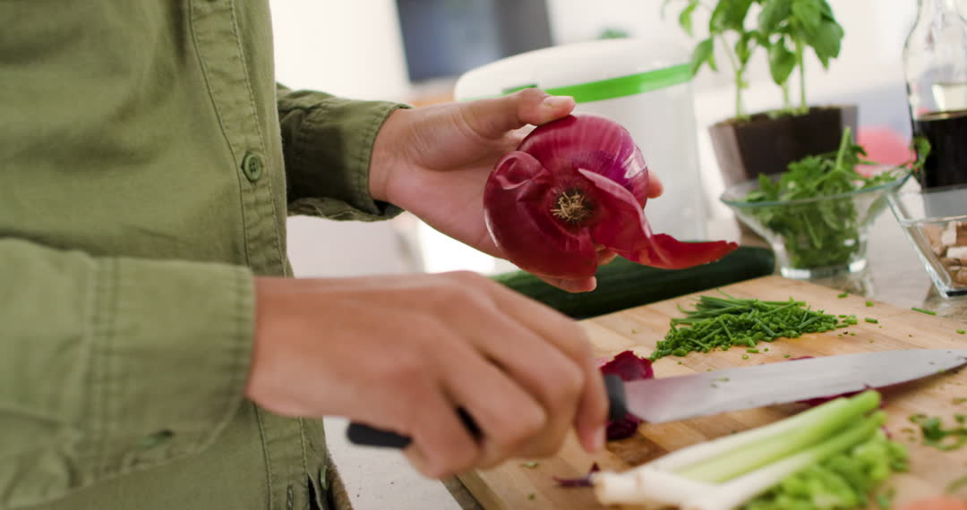 Close-up of woman skillfully cutting fresh vegetables on a chopping board with a sharp knife in a home kitchen. The focus captures the detailed hand movement, the vibrant color of the onions, and the crisp vegetables surrounding the board. Ideal for promoting healthy lifestyles, culinary skills, or home cooking blogs. Great for use in content about home improvement or cooking classes.