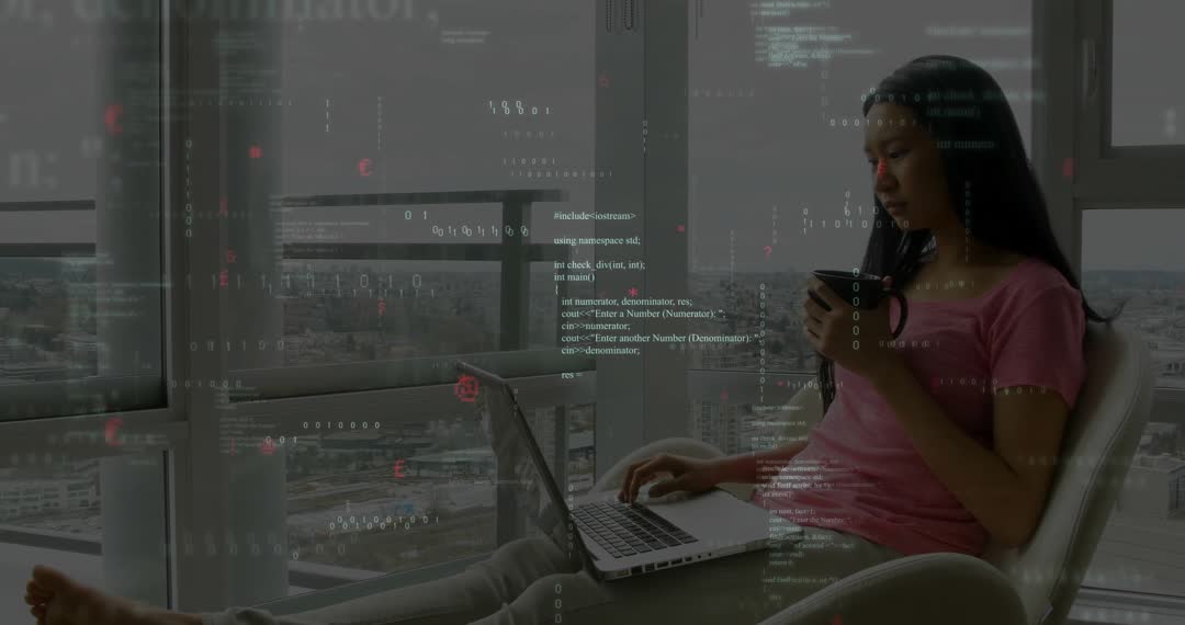 This scene portrays a woman coding on a laptop in a sleek high-rise apartment, emphasizing an urban and professional lifestyle with a technological focus. The overlay of computer code and binary provides a dynamic and engaging element, ideal for content focusing on remote work, programming, and modern urban living. Suitable for showcasing digital innovation and empowering tech-working environments in promotional materials or articles related to tech industries.