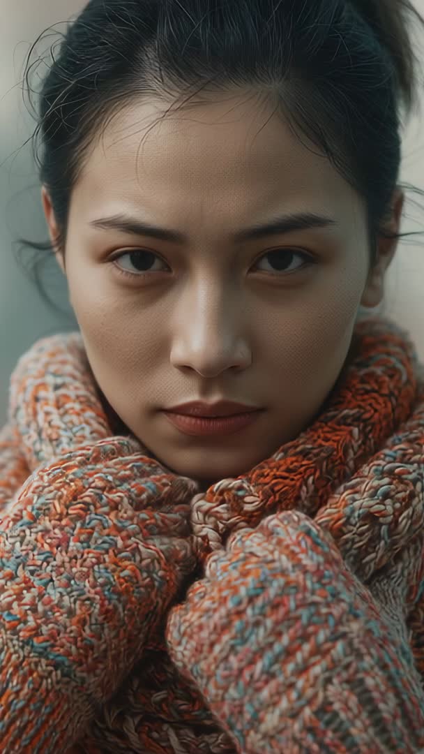 AI Generated Video. Close-up vertical video showing woman pulling knit scarf around neck while holding steady gaze at camera and pressing mittened hands for warmth. Muted winter tones and chunky knit texture creating cozy, intimate mood and highlighting facial expression and fabric detail. Framing and lighting drawing attention to warmth, insulation, calm confidence, and seasonal fashion styling. Suiting social media reels, Instagram and TikTok vertical ads, homepage hero video, product landing pages, seasonal email headers, winter campaign commercials, editorial features, and mood-setting background for apps. Use suggestions: pairing with winter clothing promotions, cold-weather travel guides, self-care and wellness content, beauty and skincare messaging, cozy home living articles, or stock footage libraries needing relatable portrait footage.