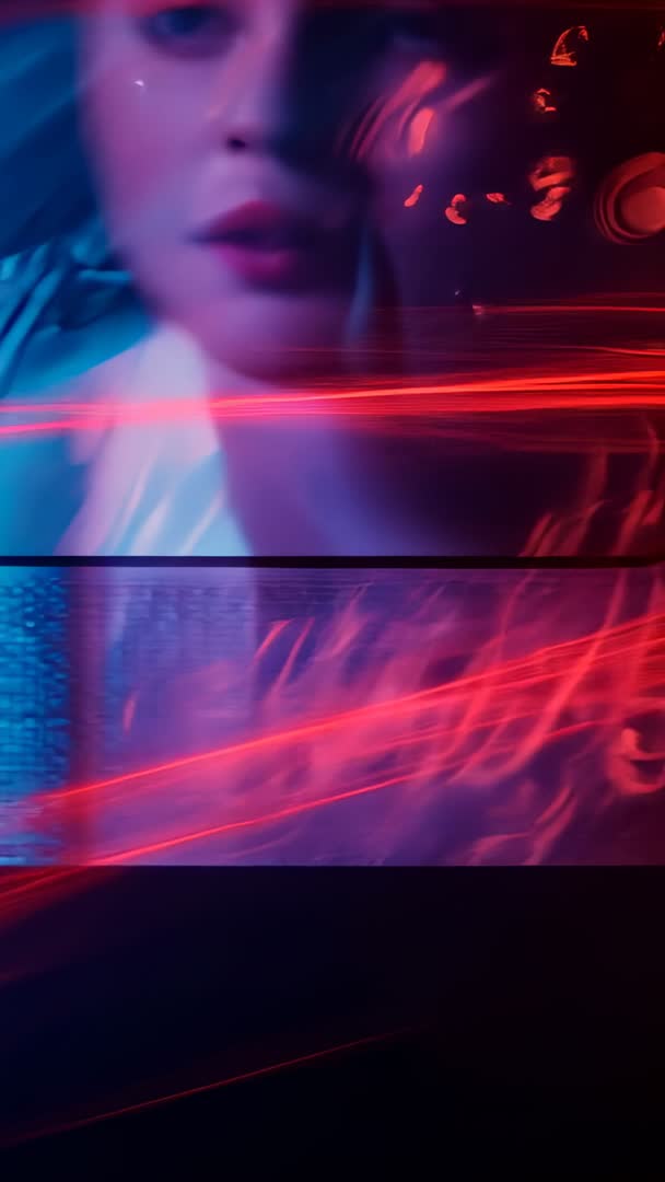 AI Generated Image. Offering moody cyberpunk atmosphere with neon red streaks, glitch scan lines, and split-band composition. Vertical format capturing close-up woman reacting to light and motion with soft-focus portrait and abstract lower-band light trails. Working well for music video intros, fashion promos, social media stories, mobile ads, tech or gaming channels, and nightclub visuals. Suggesting layering with bold typography, animated lower-thirds, chromatic aberration, and quick cuts to enhance kinetic feel. Using as background for product reveal, editorial package, VJ loop, or cinematic trailer. Favoring teal and magenta color grading to boost contrast and futuristic mood. Delivering cinematic, edgy aesthetic for branding, storytelling, and motion design projects.