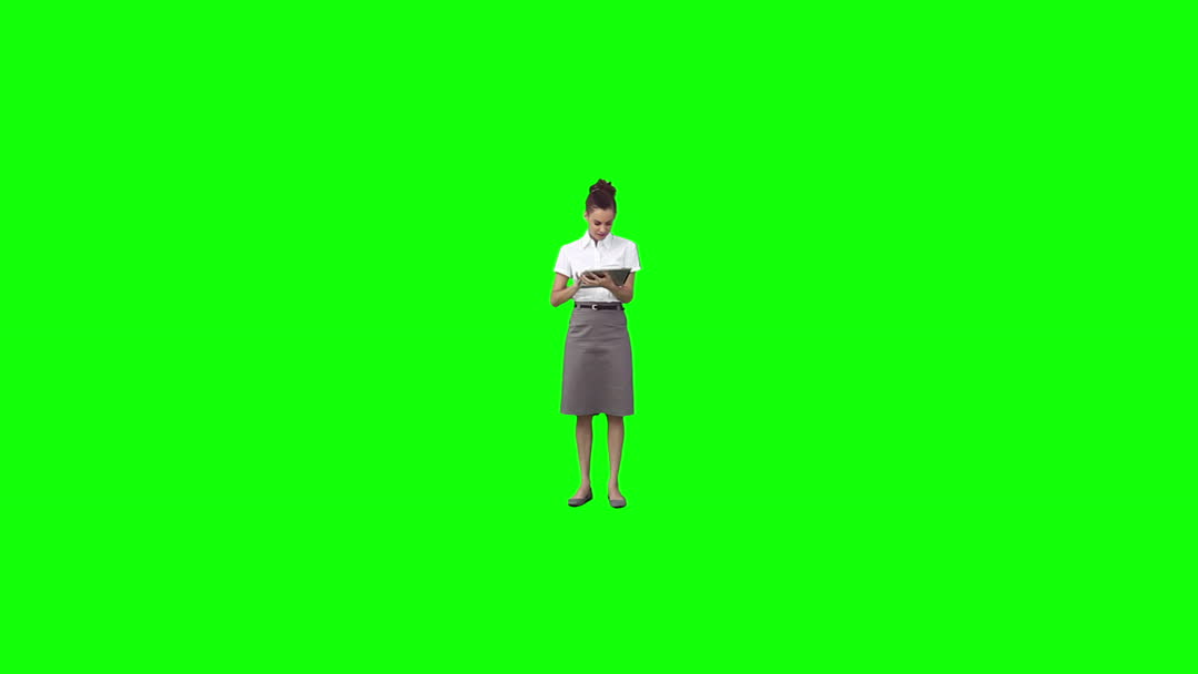 A woman standing against a green screen background, engaging with her ebook. She is dressed in business attire, showcasing an interest in technology and modern reading solutions. Ideal for use in advertising technology-related products, educational content, or business presentations where a professional setting is required and the visual aspect can be easily edited.