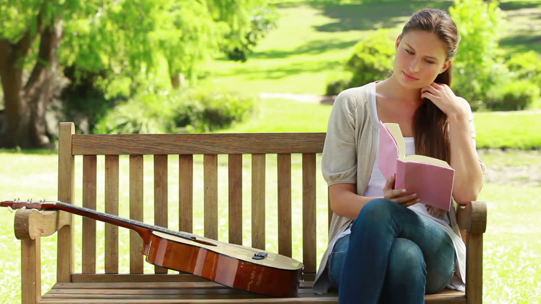 - Woman Reading on Park Bench with Guitar in Tranquil Outdoors