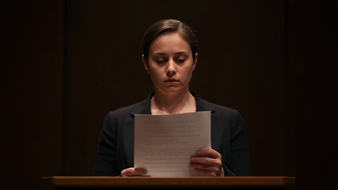Woman Reading Statement While Testifying at Court Podium Under Spotlight During Hearing Video